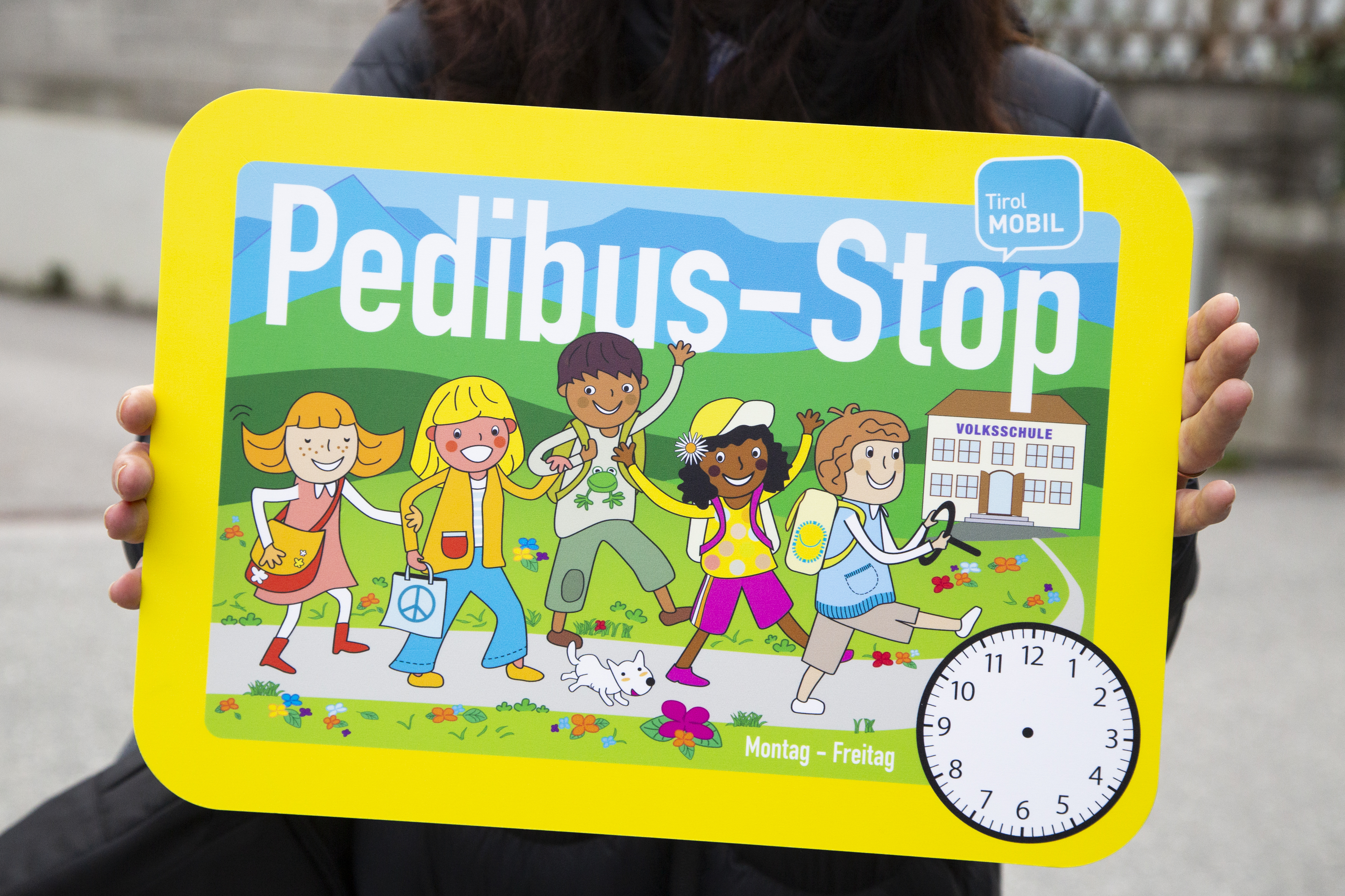 In den ersten Schulwochen hatten die Kinder in mehr als 30 Tiroler Gemeinden ein besonderes „Verkehrsmittel“ zur Verfügung: den Pedibus. Die bunten Pedibus-Haltestellentafeln sind mittlerweile in über 30 Tiroler Gemeinden zu sehen.
