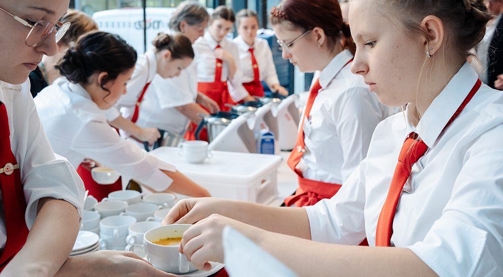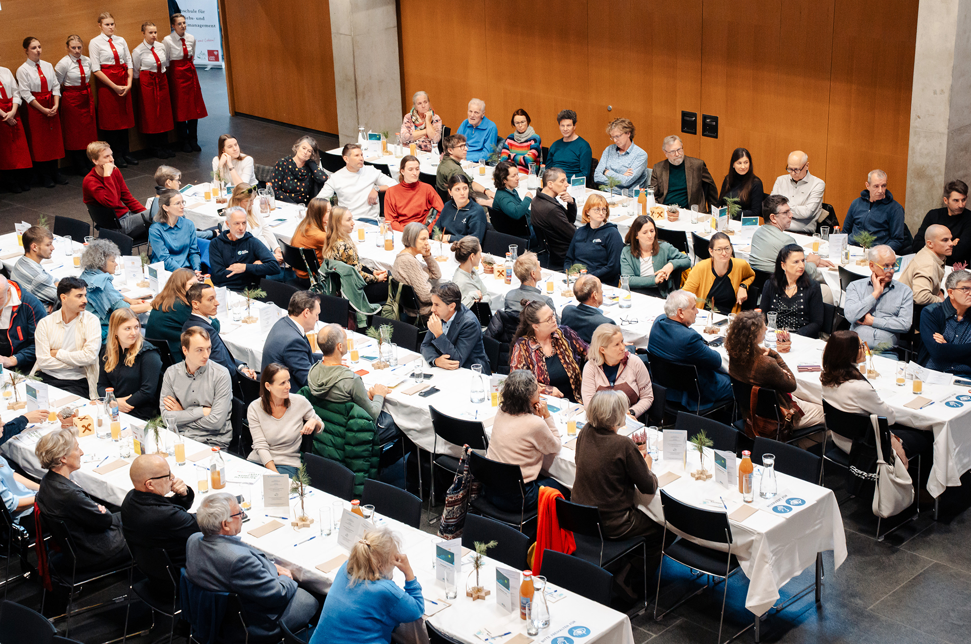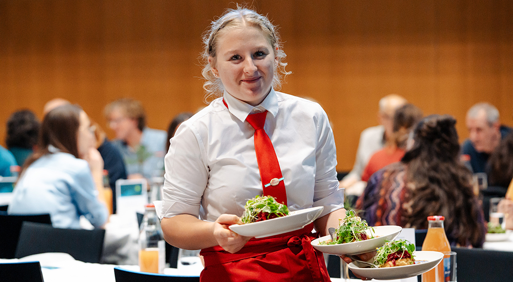 Das dreigängige, vegetarisch-vegane Menü wurde von Schülerinnen der Landwirtschaftlichen Lehranstalt Rotholz, Dietmar Fröhlich (Alpine Elements & United Against Waste) sowie Theresa Fessler (Initiative DoppelPlus) zubereitet. Der volle Saal freute sich über abwechslungsreiche und genussvolle Gerichte – von der Kürbis-Topinambur-suppe über eine deftige Tirol-Bowl bis zu Apfel-Haferschnitten.