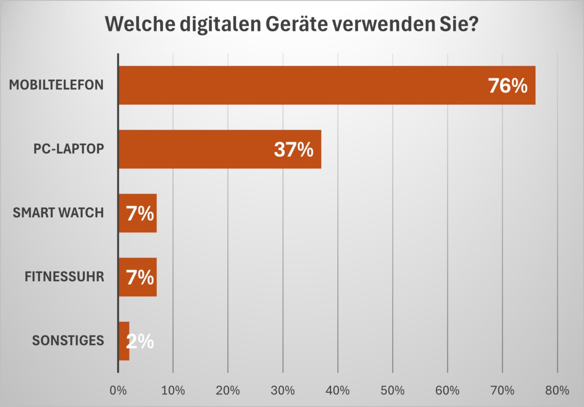 Eine empirische Erhebung im Projekt Paradies mit 134 älteren Personen (Durchschnittsalter 78 Jahre) in Wiener Neudorf und Klosterneuburg zeigt: Das Mobiltelefon ist mit Abstand das meistgenutzte digitale Gerät. 76 % der Befragten nutzen regelmäßig ein Handy, 37 % verfügen über einen PC oder Laptop. Smartwatches oder Fitnessuhren sind mit jeweils 7 % wenig verbreitet, andere digitale Technologien spielen kaum eine Rolle (2 %).