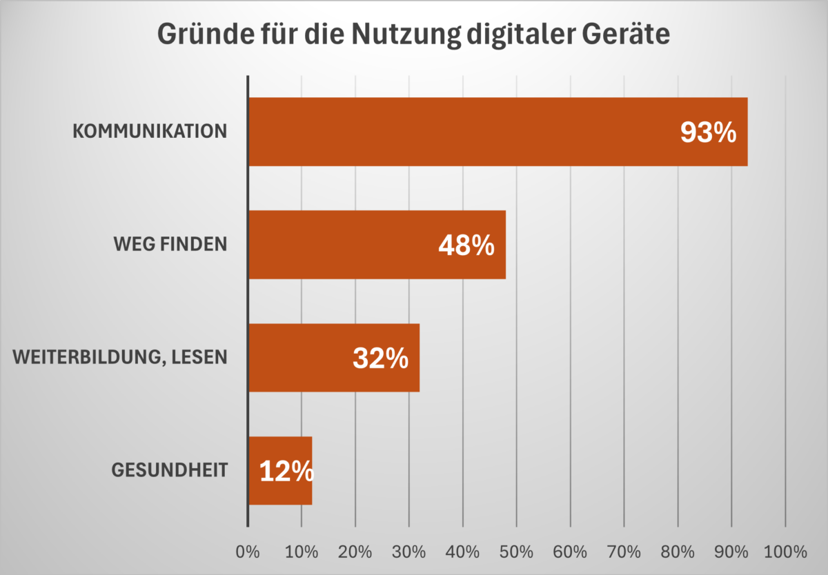 Digitale Technologien werden überwiegend zur Kommunikation genutzt (93 %). Weitere Einsatzbereiche sind Orientierung (48 %), Weiterbildung und Lesen (32 %) sowie Gesundheit (12 %).